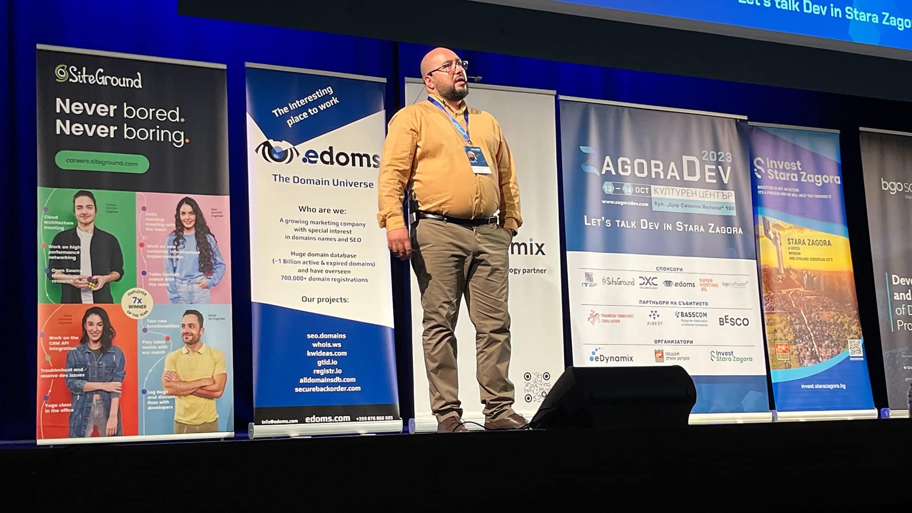The second day of ZagoraDev witnessed our co-founder, Metodi Darzev, taking the stage to deliver a captivating lecture titled “Exploring Domains’ Universe.” With his insights and expertise, attendees embarked on a journey into the multifaceted world of domains.